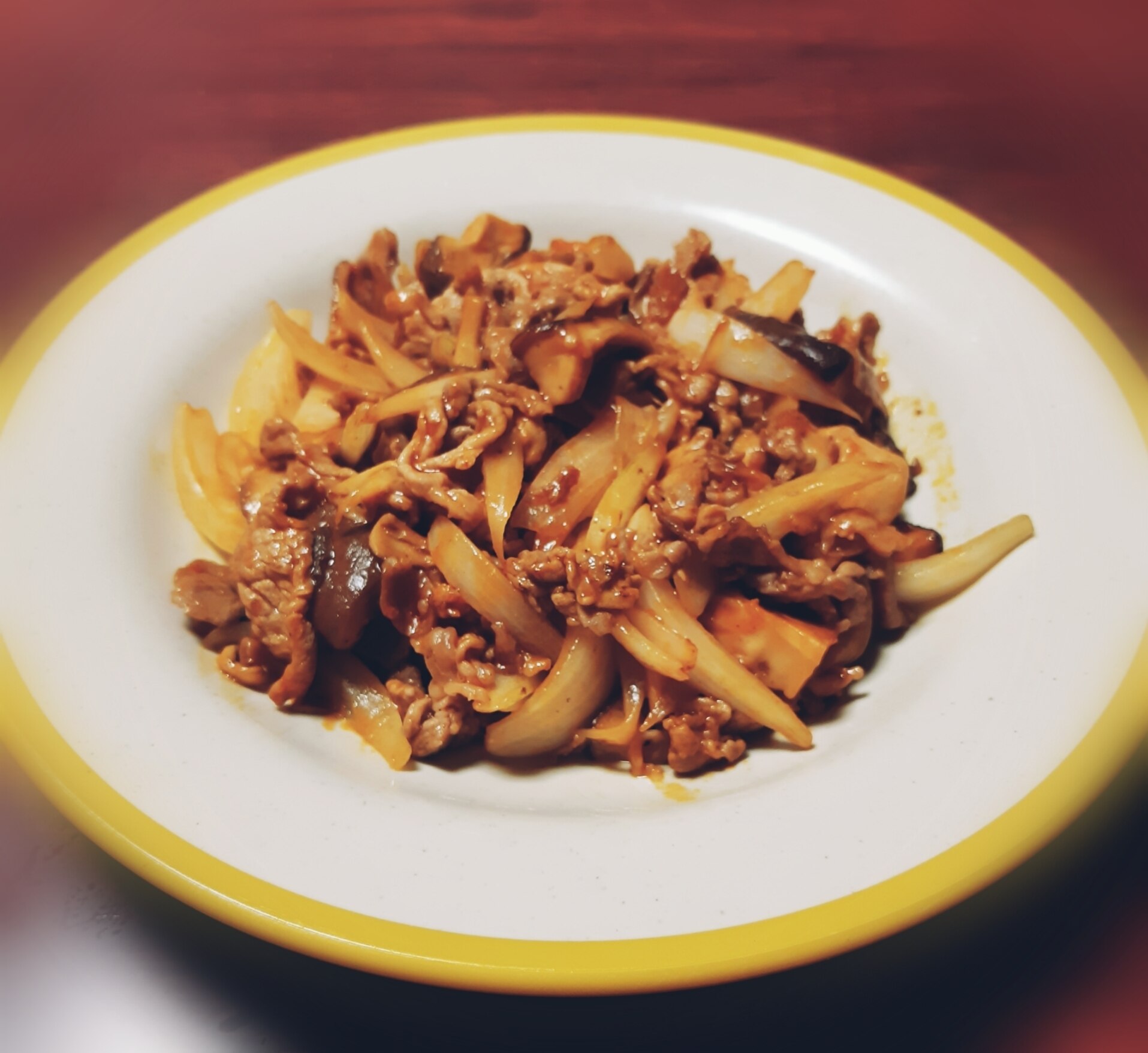 冷蔵庫で死にかけてた豚こま肉とタマネギをどうしたものかと思案。楽天レシピで検索して チリソース みたいな炒め物にしました。